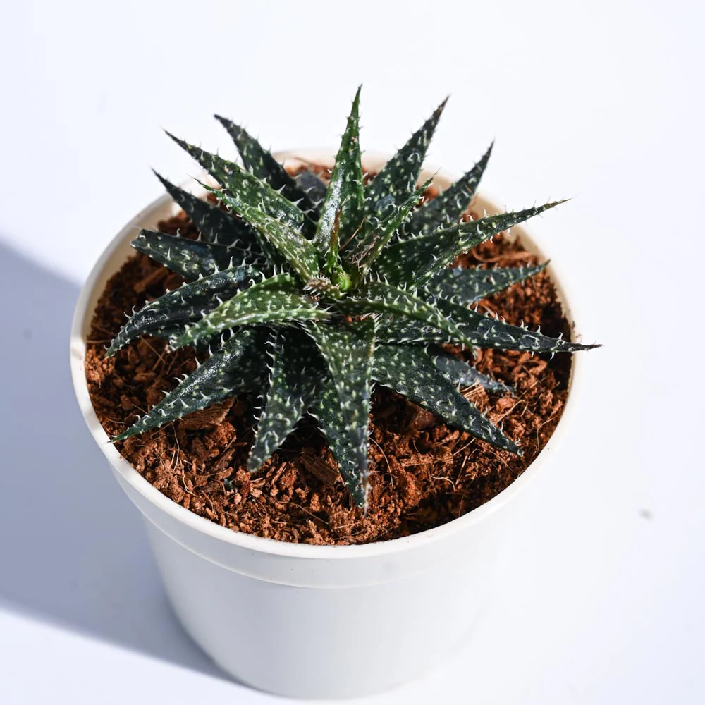 It is a beautiful dark green succulent with white zebra stripe.